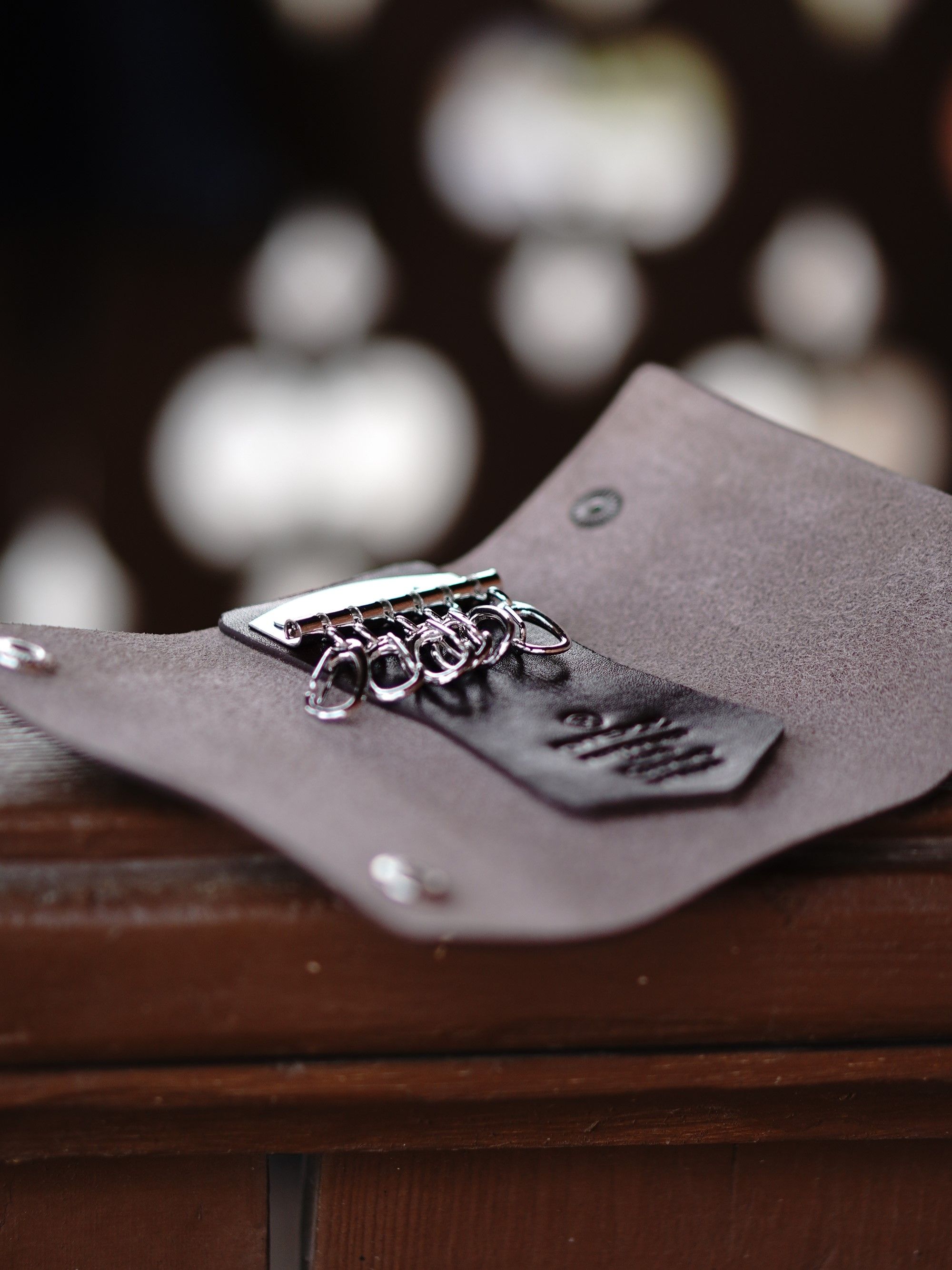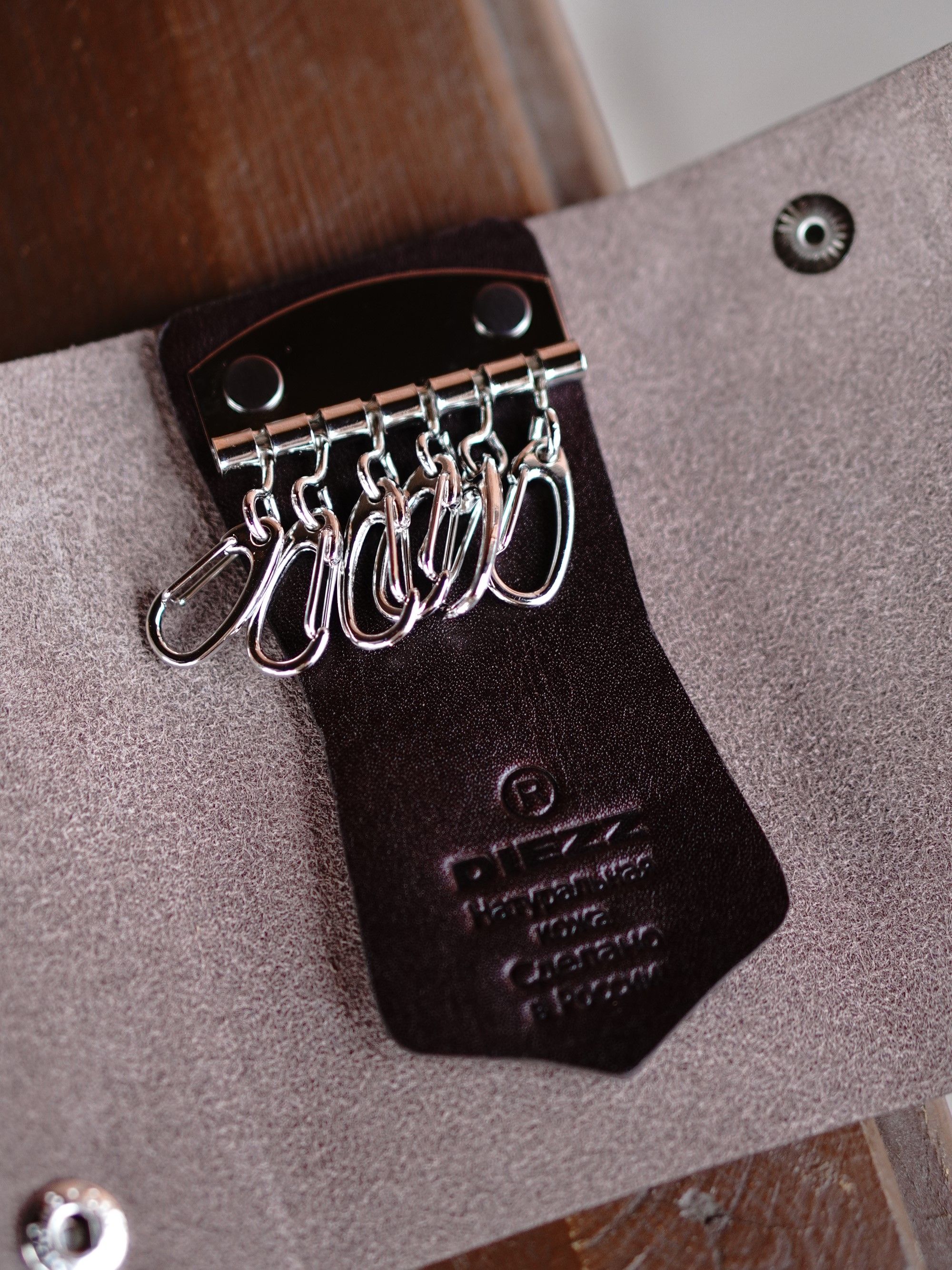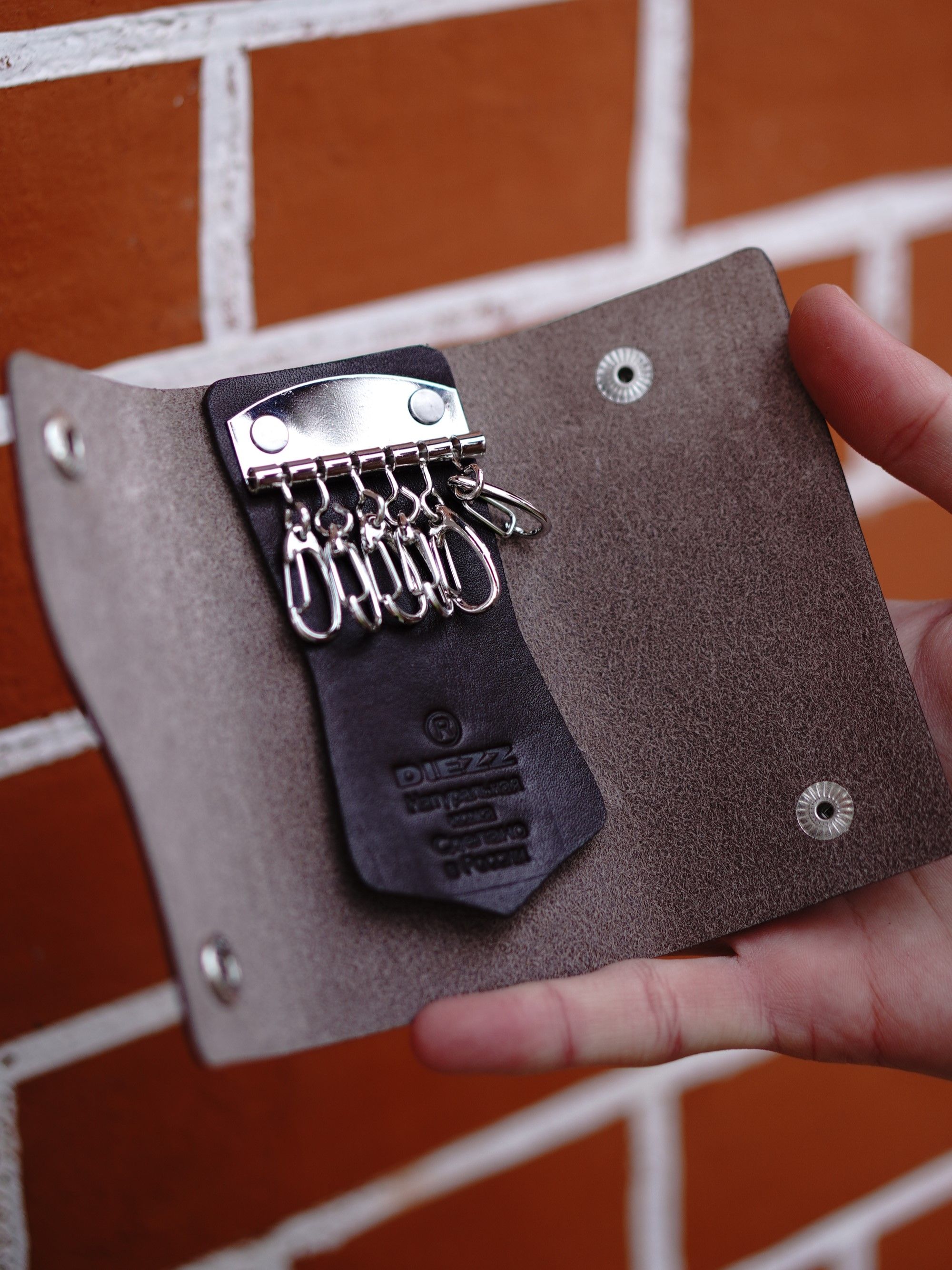 Изделие с серебряными заклёпками (хольнитенами), с кожаной ярлычком, с 6 застёжками-карабинами для ключей.