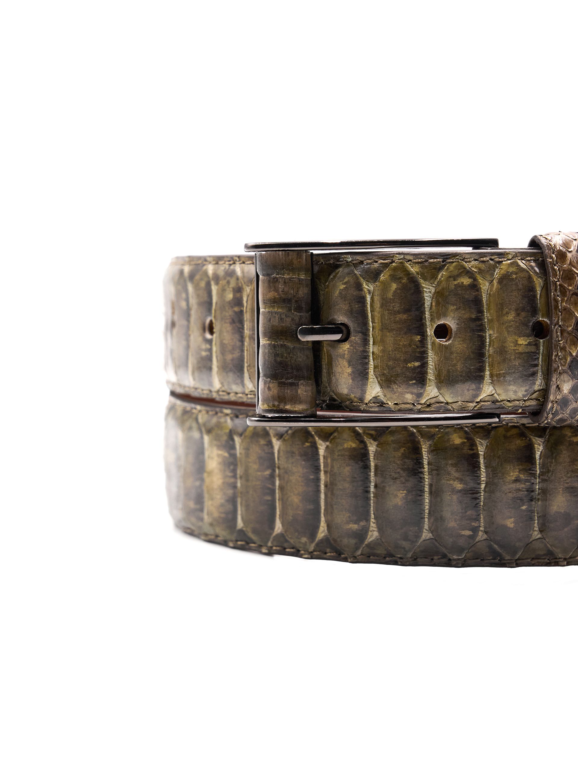 Металлическая прямоугольная пряжка декорирована лоскутом кожи питона. Пряжка фиксируется при помощи винта, что позволяет с легкостью укоротить ремень.